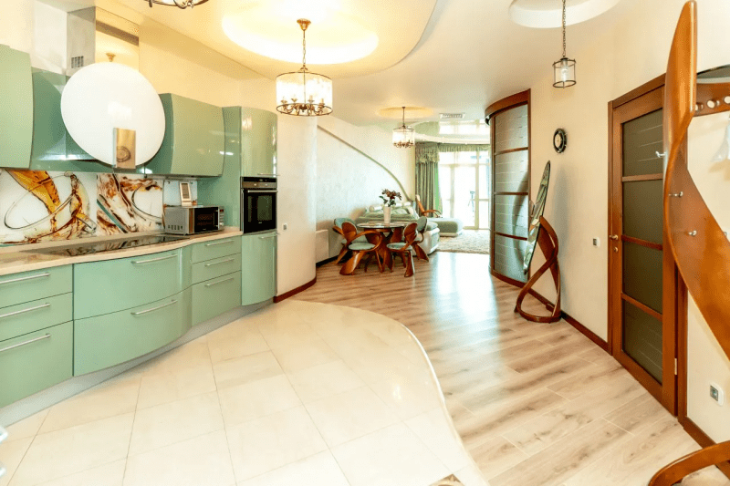 На кухне есть большой холодильник, электрочайник, микроволновая печь, кофемашина, вытяжка, электроплита, электродуховка, кофеварка, блендер, тостер, набор посуды.
